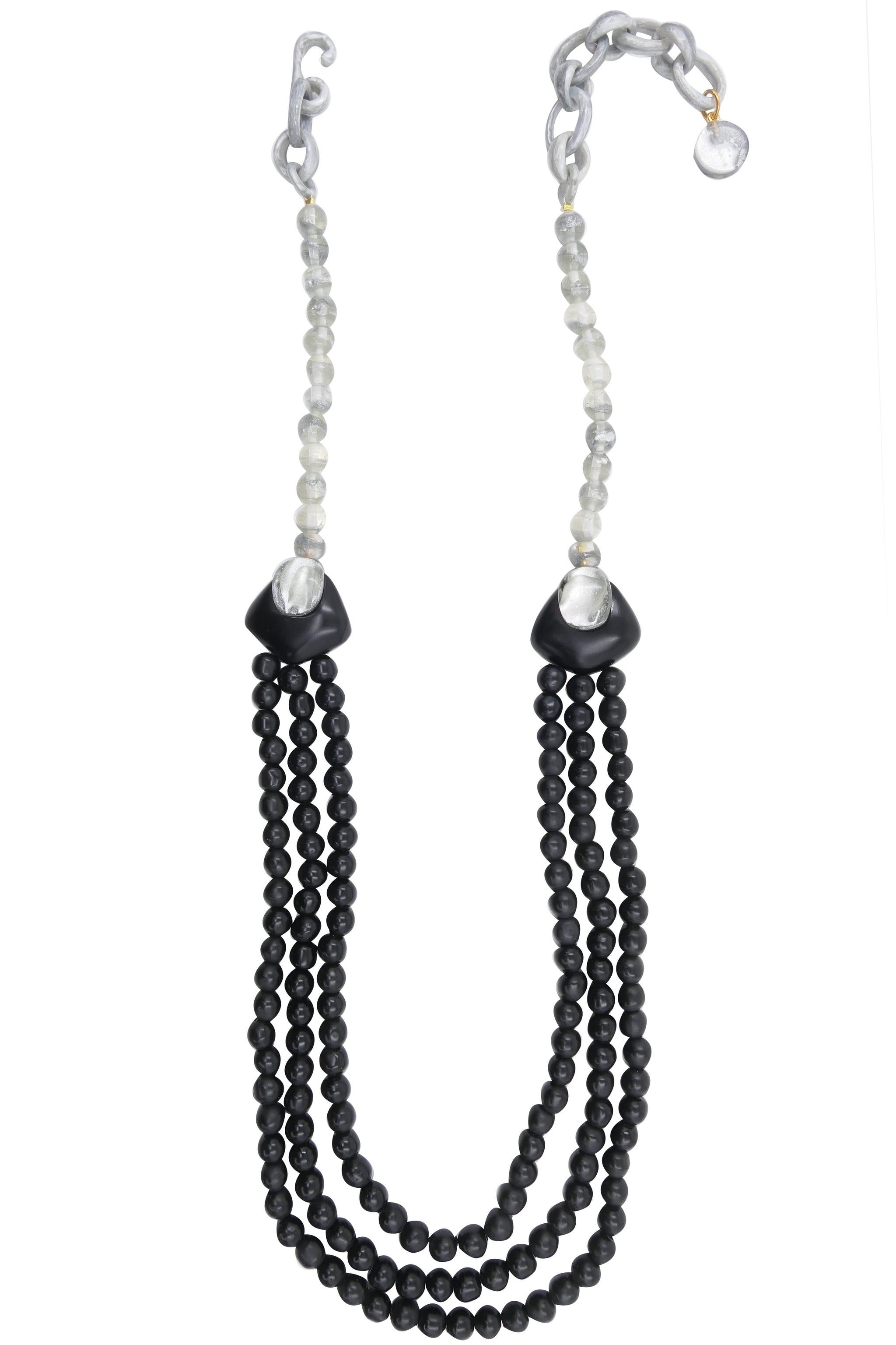 Véritable pièce maîtresse, le sautoir Béra signe votre allure d’un chic à la fois raffiné et audacieux. Ses trois rangs de perles en résine artisanale, reliés par un fermoir élégant, dessinent une ligne sophistiquée autour du buste. Deux cabochons sculpturaux rythment cette harmonie, captant la lumière pour un éclat subtil.