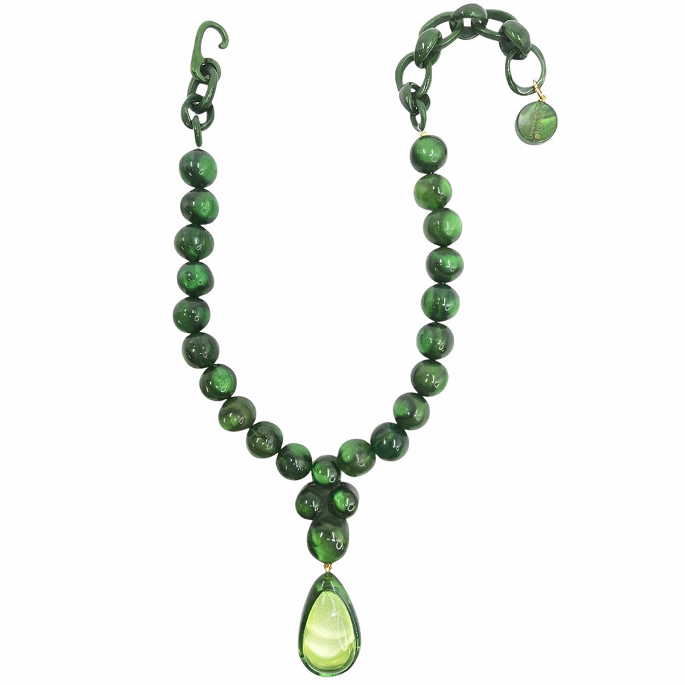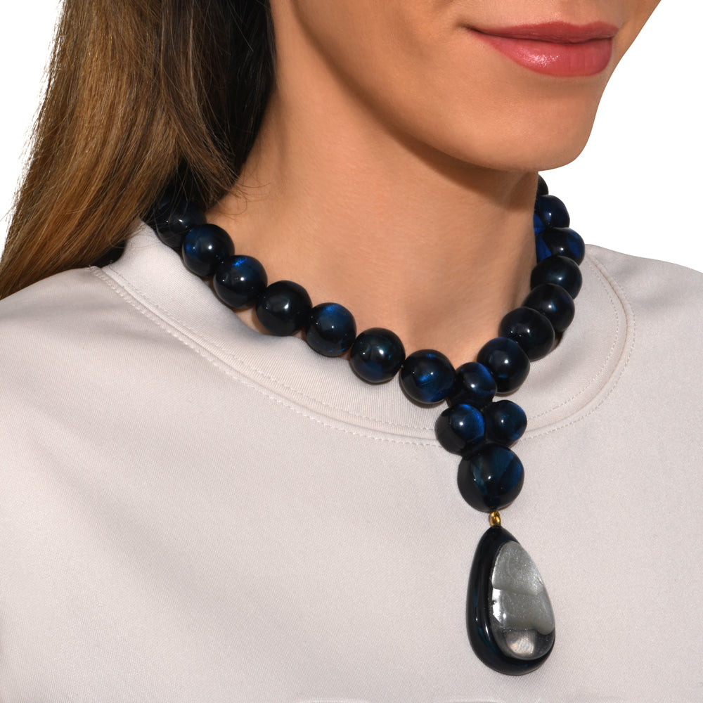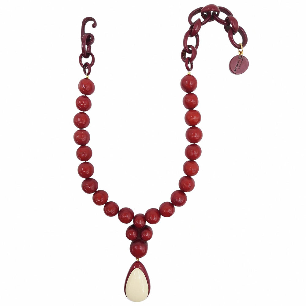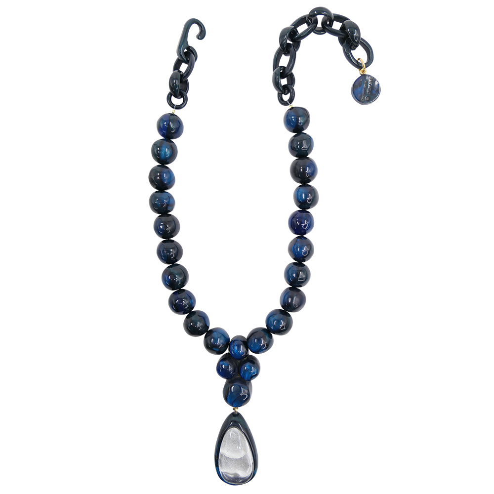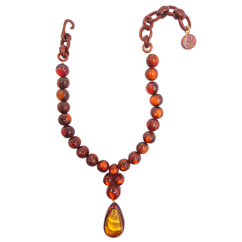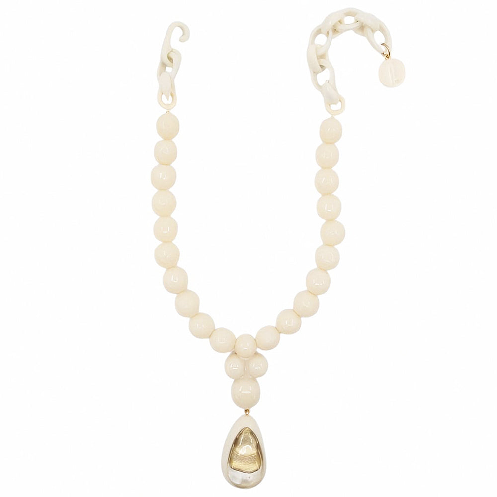 Alberta se compose d’une rangée de perles généreuses en résine artisanale, agrémentée d’un pendentif goutte double-couche, créant un effet sculptural autour du décolleté. Son design, alliant volumes équilibrés et lignes épurées, incarne une élégance contemporaine et affirmée.