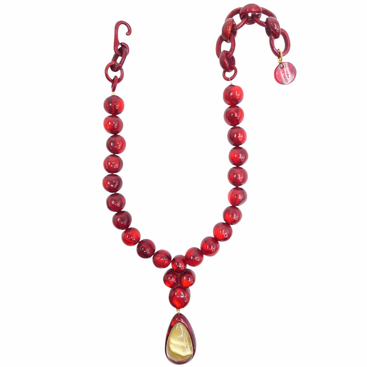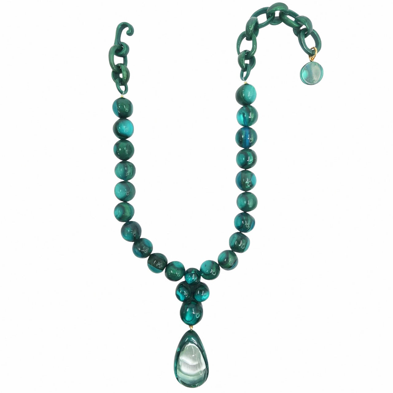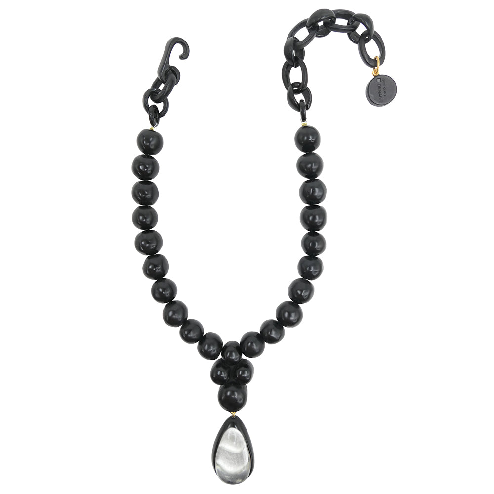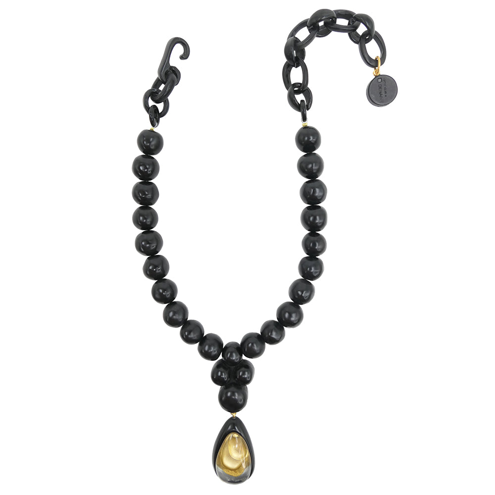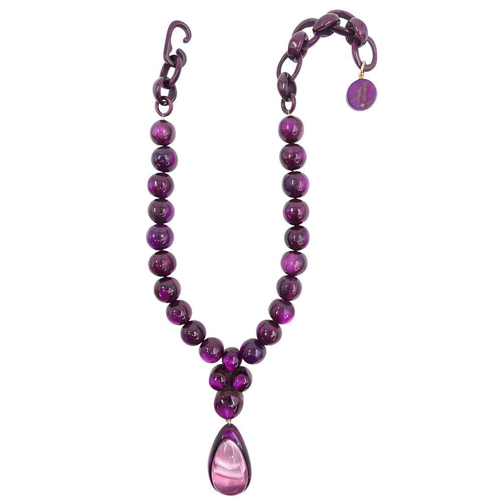 Alberta se compose d’une rangée de perles généreuses en résine artisanale, agrémentée d’un pendentif goutte double-couche, créant un effet sculptural autour du décolleté. Son design, alliant volumes équilibrés et lignes épurées, incarne une élégance contemporaine et affirmée.