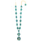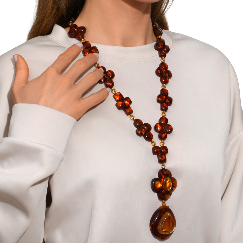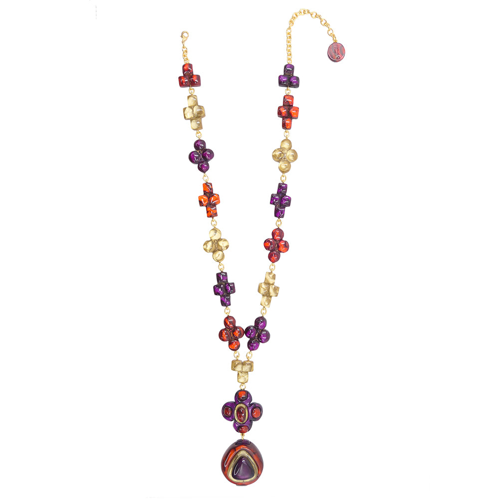 Conçu et façonné dans l’atelier Dominique Denaive, Lucy associe une chaîne de trèfles stylisés en résine à un pendentif central croix byzantine, agrémenté d’un cabochon précieux suspendu. Les anneaux en métal doré soulignent chaque articulation, pour un effet baroque tout en légèreté.