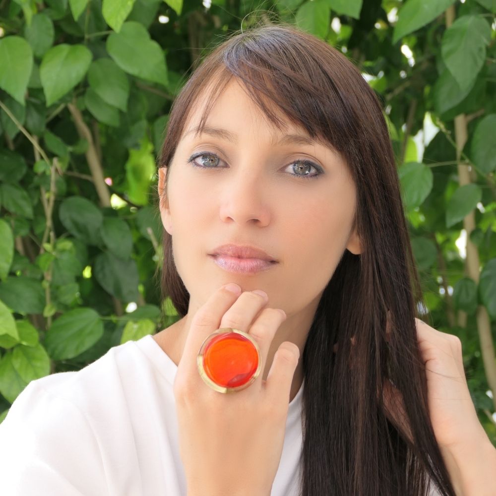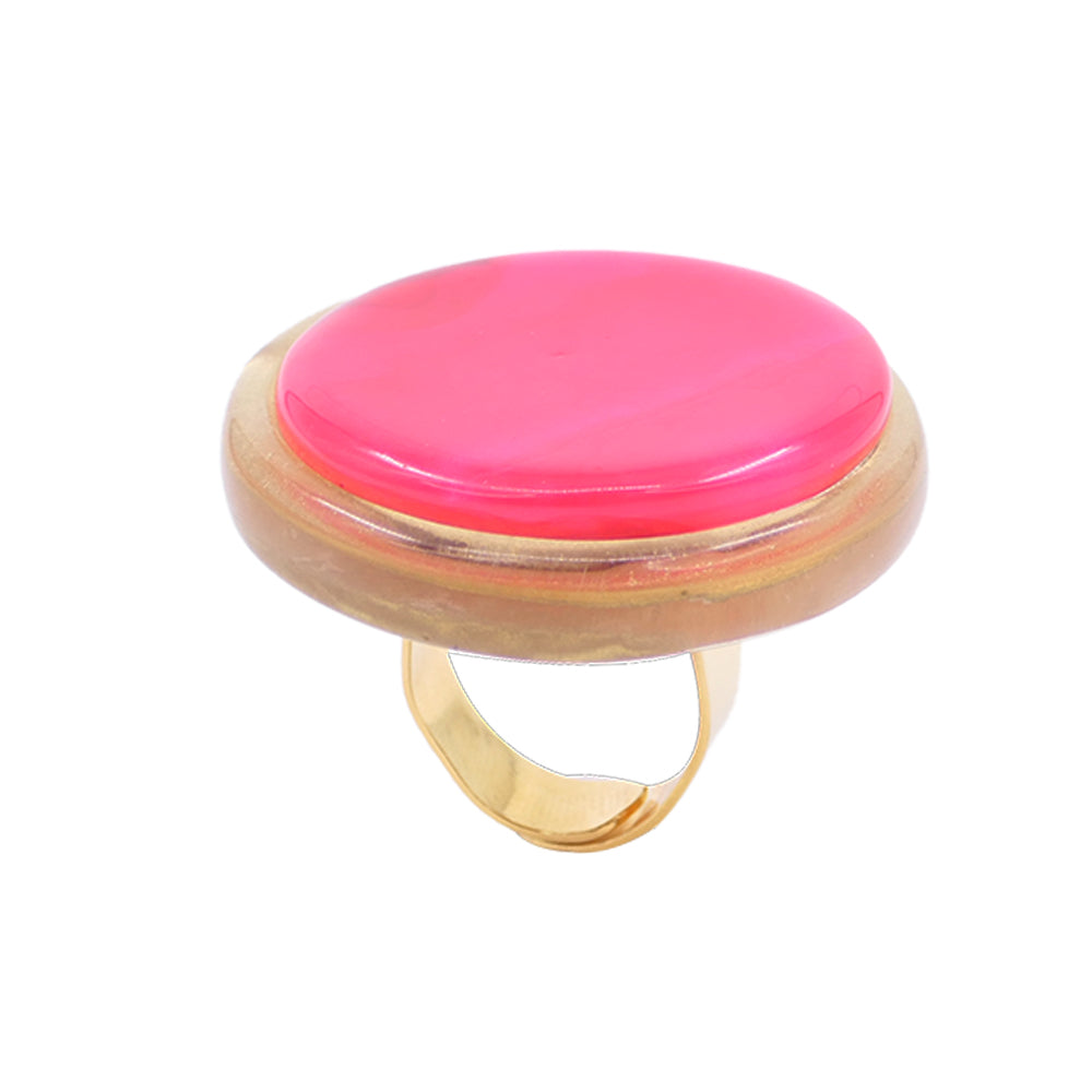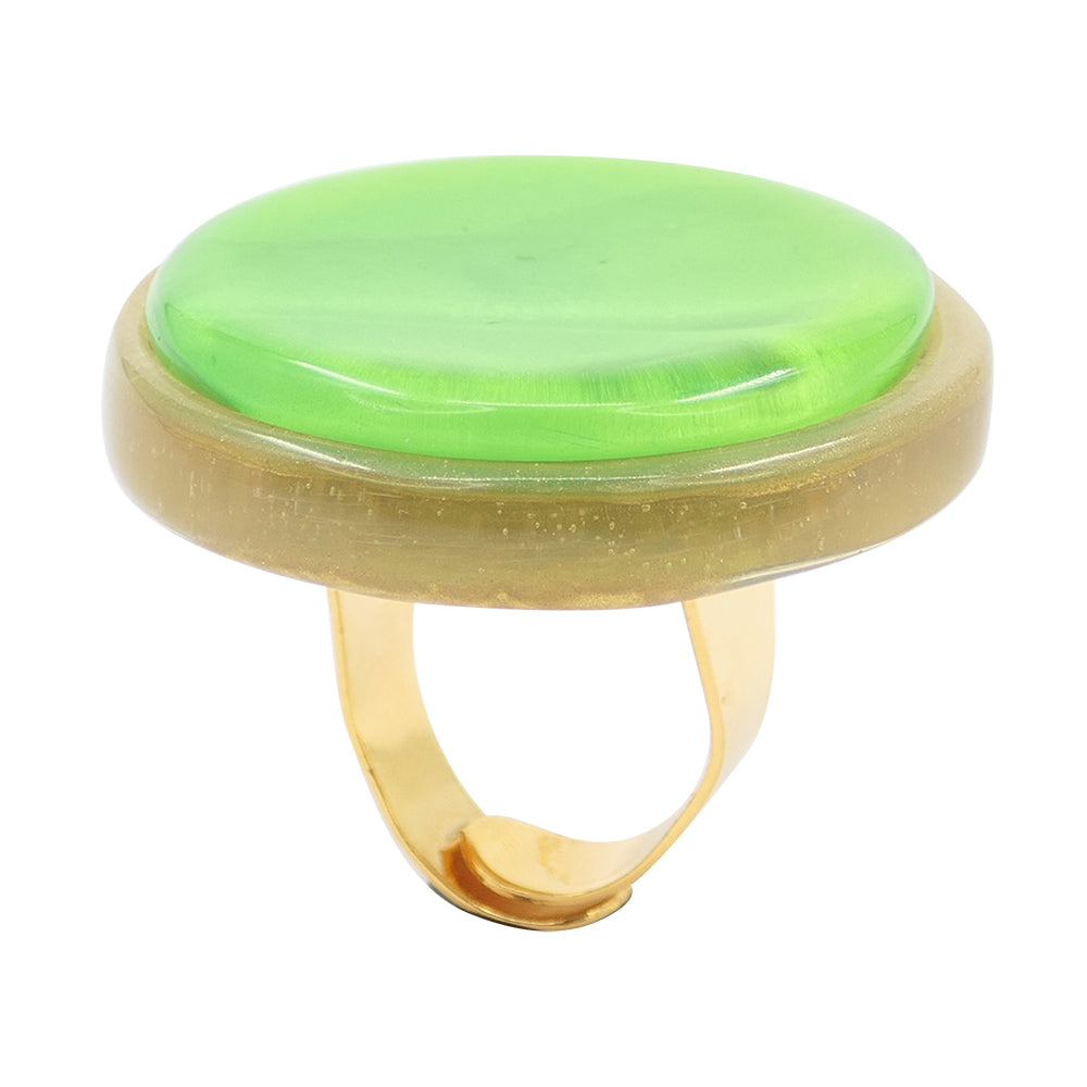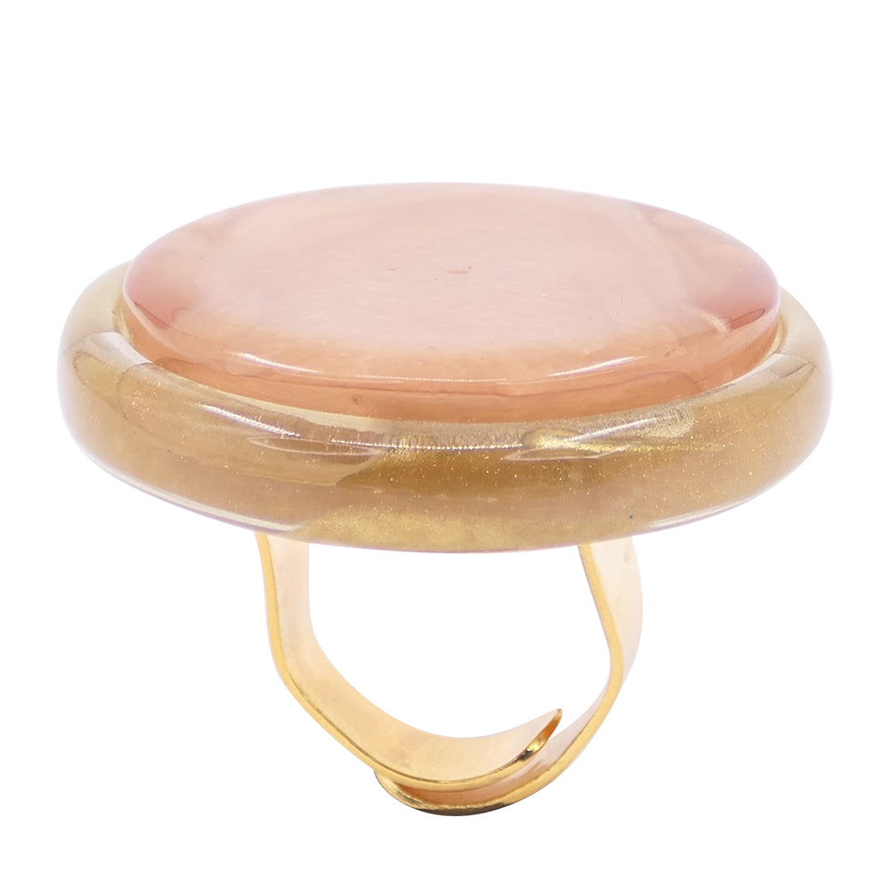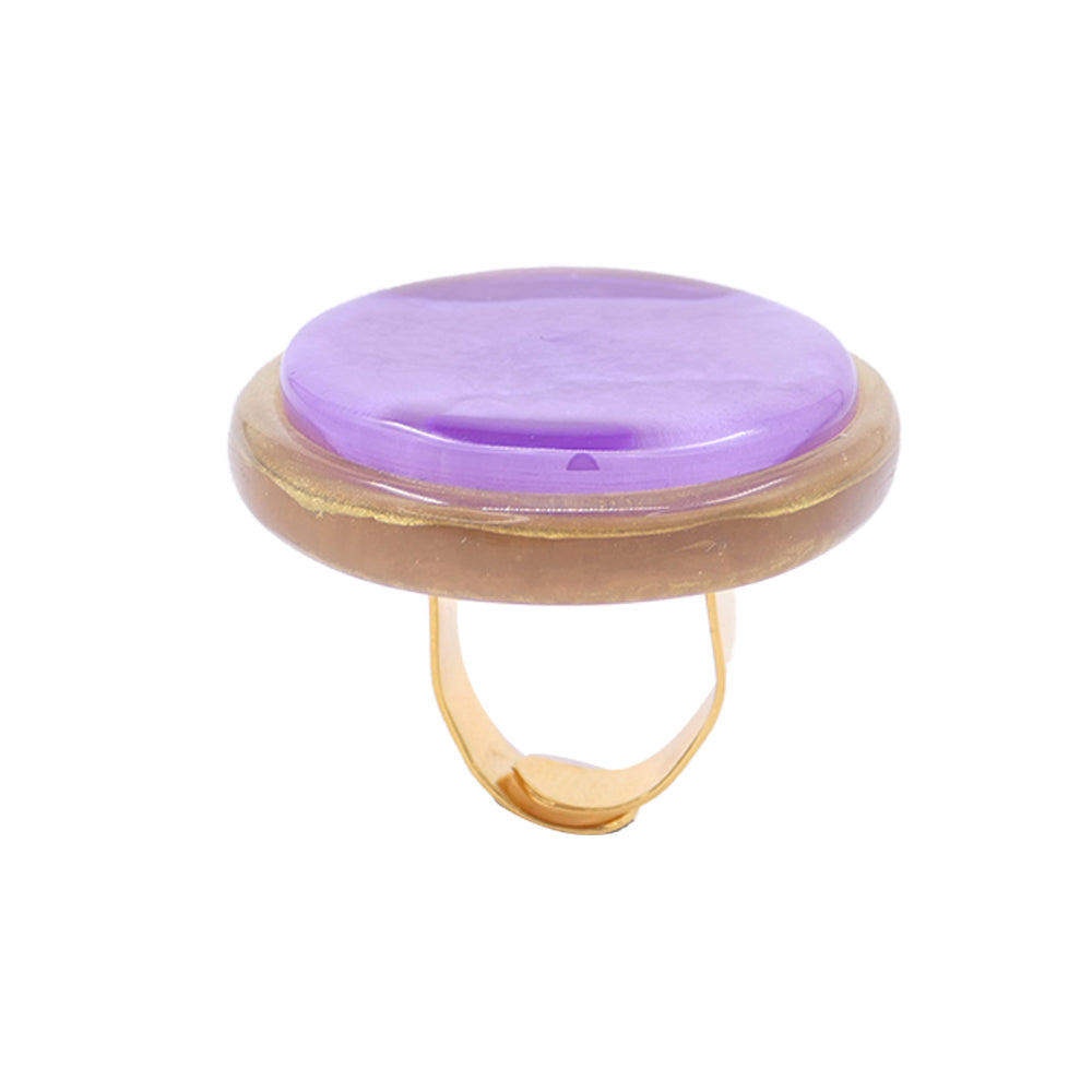 This new ring is made up of a beautiful round setting set with a cabochon of handcrafted resin infused with mother-of-pearl and gold powders.