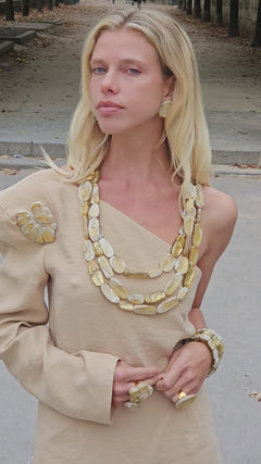 Tous nos bijoux sont imaginés par le créateur Dominique Denaive. Ils sont ensuite fabriqués manuellement dans nos propres ateliers. Les parties métalliques sont en laiton galvanisé, dorure ou argenture.