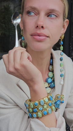 Tous nos bijoux sont imaginés par le créateur Dominique Denaive. Ils sont ensuite fabriqués manuellement dans nos propres ateliers. Les parties métalliques sont en laiton galvanisé, dorure ou argenture.