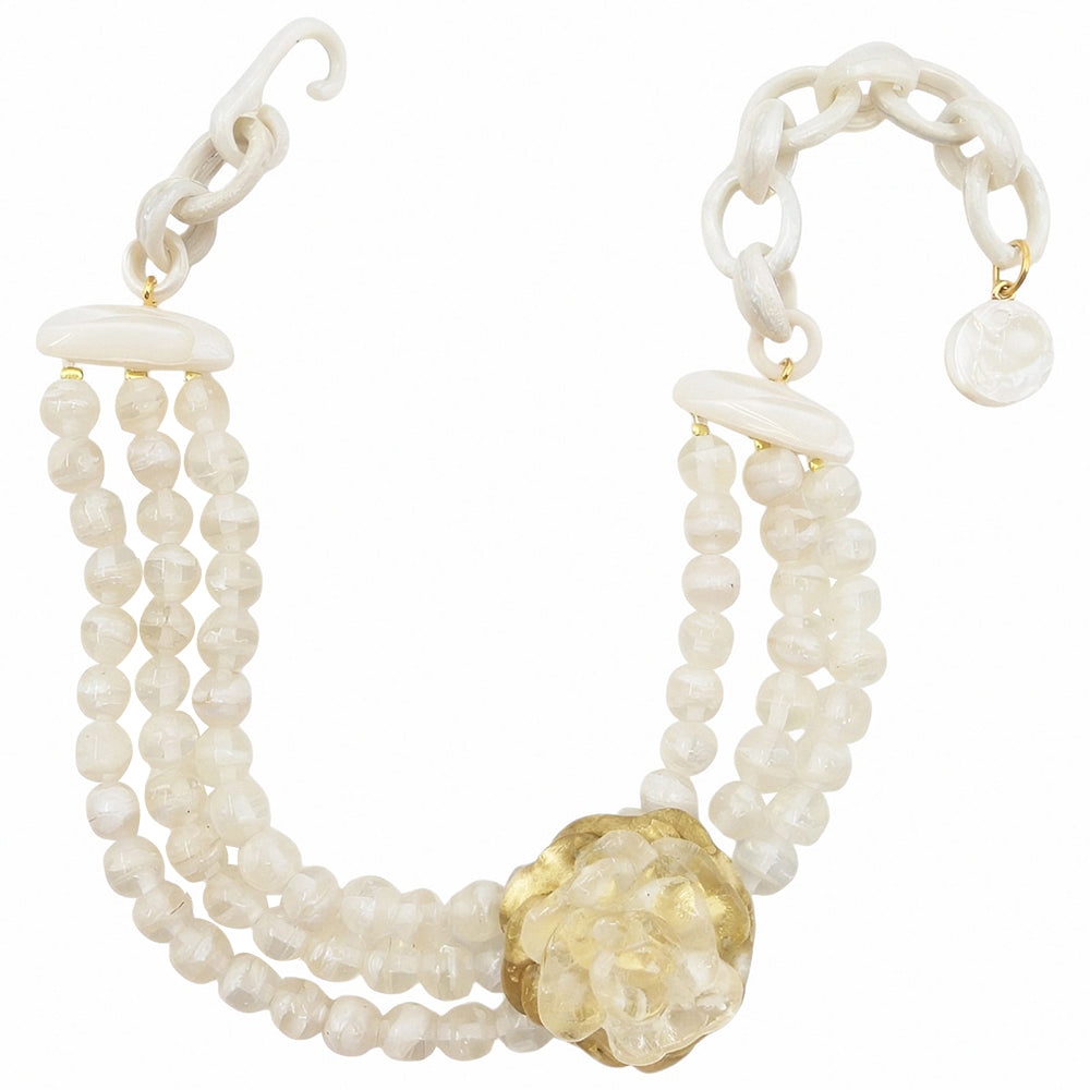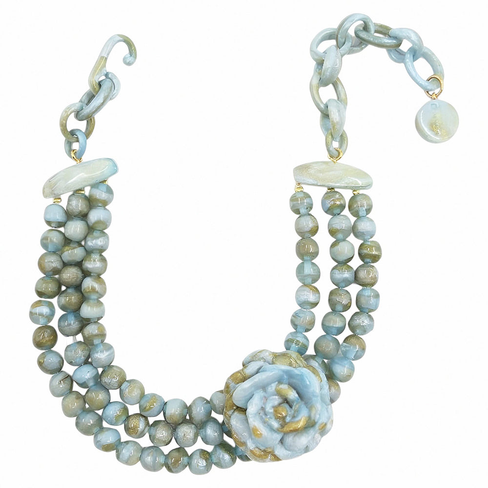 Ce magnifique collier court présente une magnifique fleur de résine artisanale montée sur 3 rangs de délicates perles. Il agrémentera votre décolleté d'une superbe note de chic pour sublimer vos tenues.