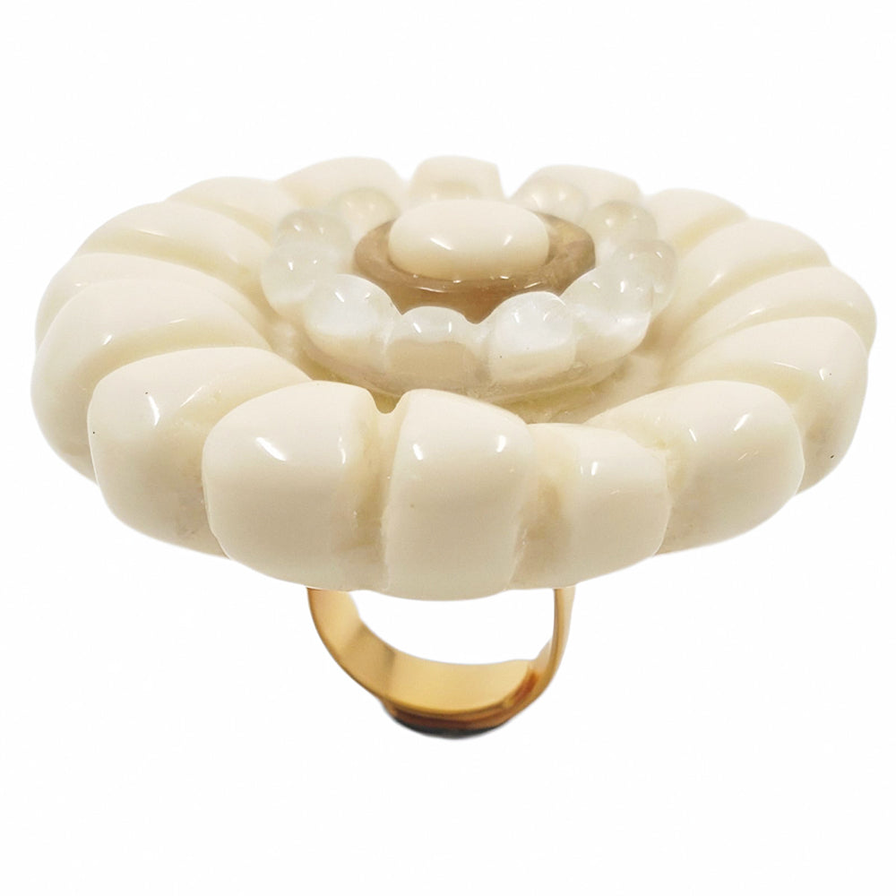 Reprenant l’esprit de la broche iconique, Dalina déploie une généreuse fleur en résine, ourlée de pétales translucides et centrée d’un cabochon. Avec sa monture ajustable en laiton doré, elle allie audace sculpturale et confort sur-mesure.