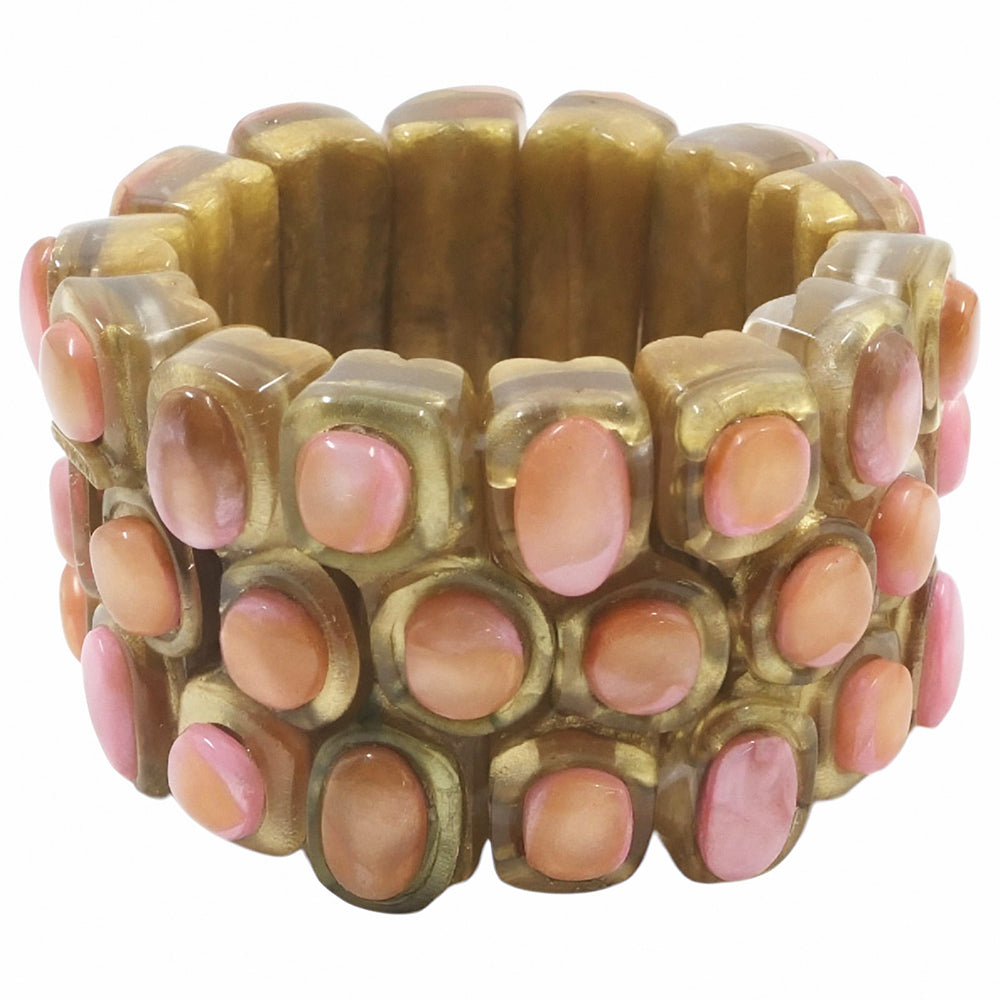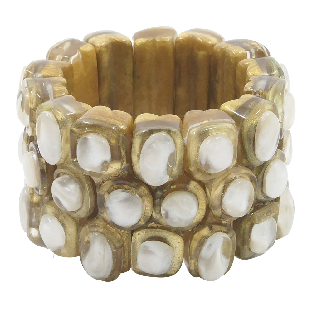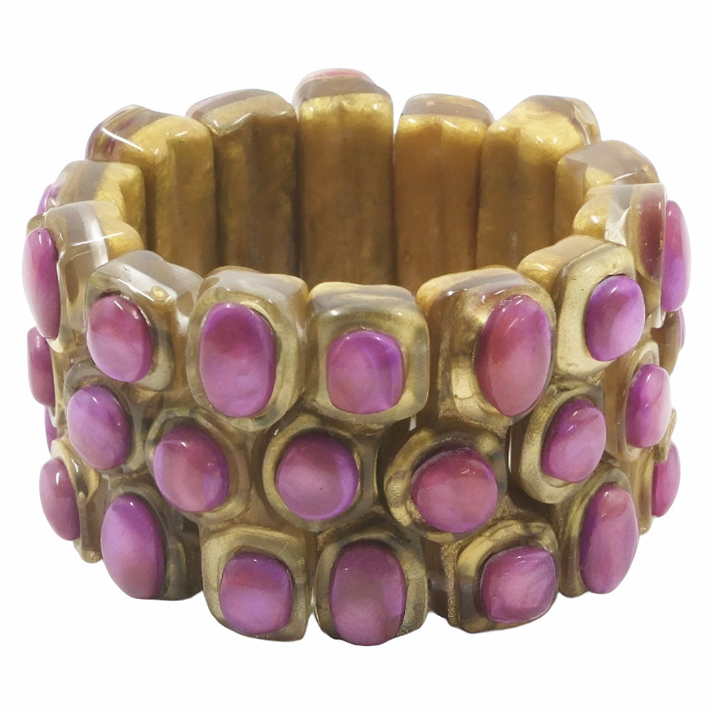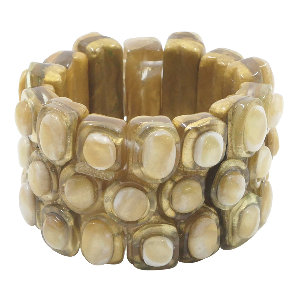 C'est toute l'opulence de la mythique Byzance qui s'exprime sur cette manchette aux multiples cabochons enchâssés dans la résine artisanale méticuleusement polie à la main. Une évocation de brillance et de séduction intemporelle qui illuminera votre poignet comme un accessoire indispensable pour signer une silhouette assurément précieuse.
