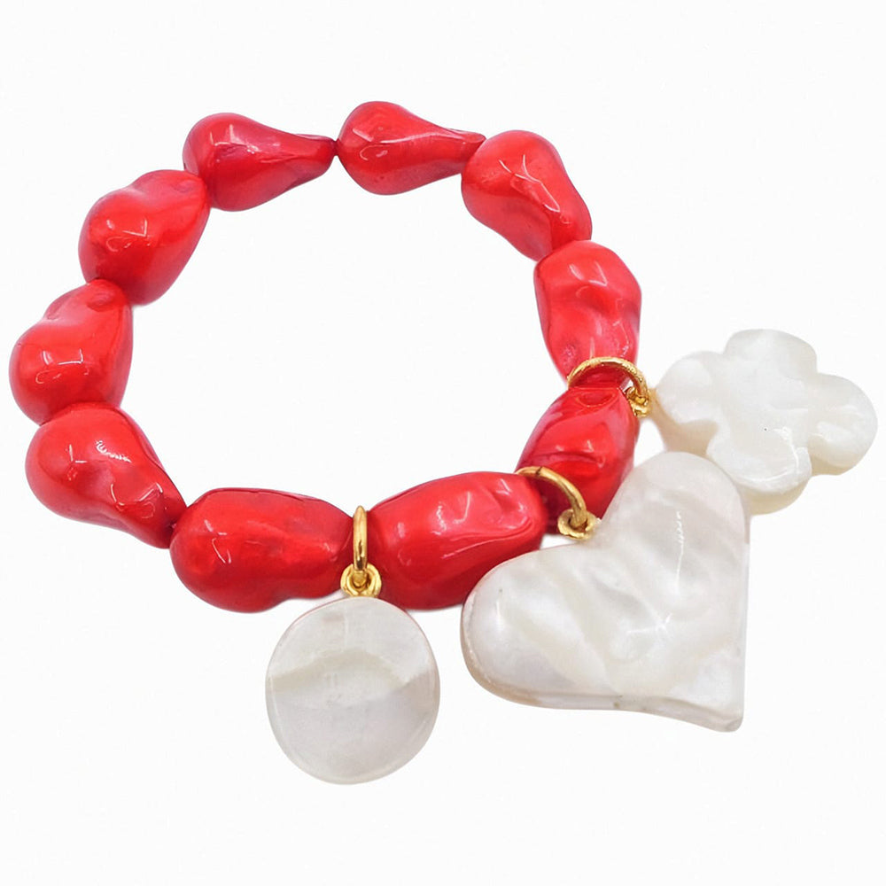 Ce superbe bracelet en résine est constitué d'éléments de résine aux formes irrégulières des perles baroques est agrémenté de charms en forme de cœur et trèfle de résine artisanale. Son design aussi original que raffiné ornera votre poignet d'une belle note de glamour pour parfaire l'allure féminine de votre silhouette.