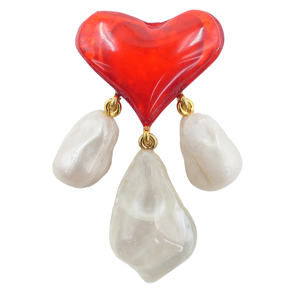 Cette superbe broche en résine en forme de cœur agrémentée de 3 éléments de résine artisanale infusée de poudre de nacre rappelant les perles baroques évoque l'opulence des bijoux de la grande époque de la Haute couture française.