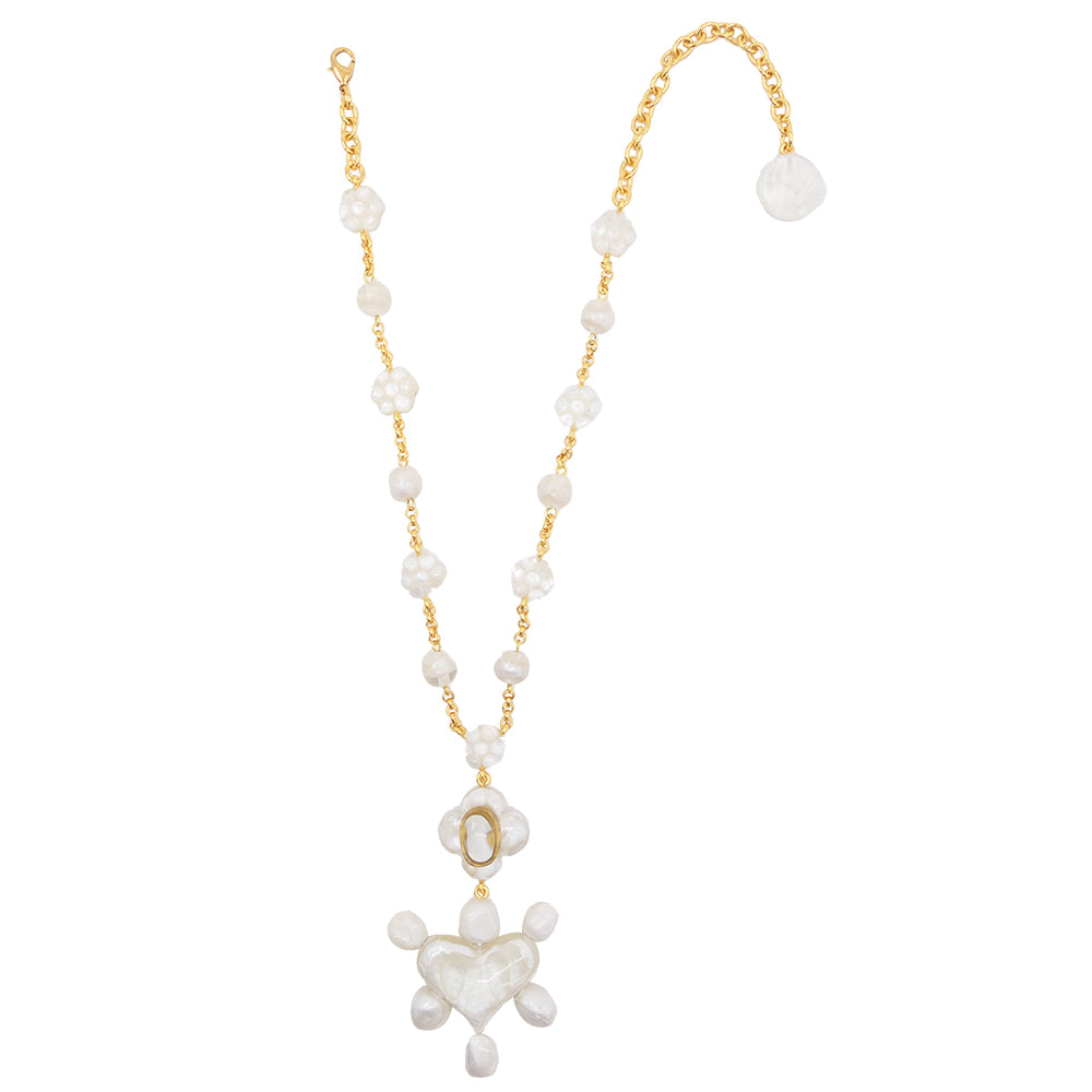 La chaine constituée d'anneaux de métal doré présente une alternance d'éléments de résine artisanale à laquelle se suspend un pendentif en forme de cœur nimbée de "perles baroques".