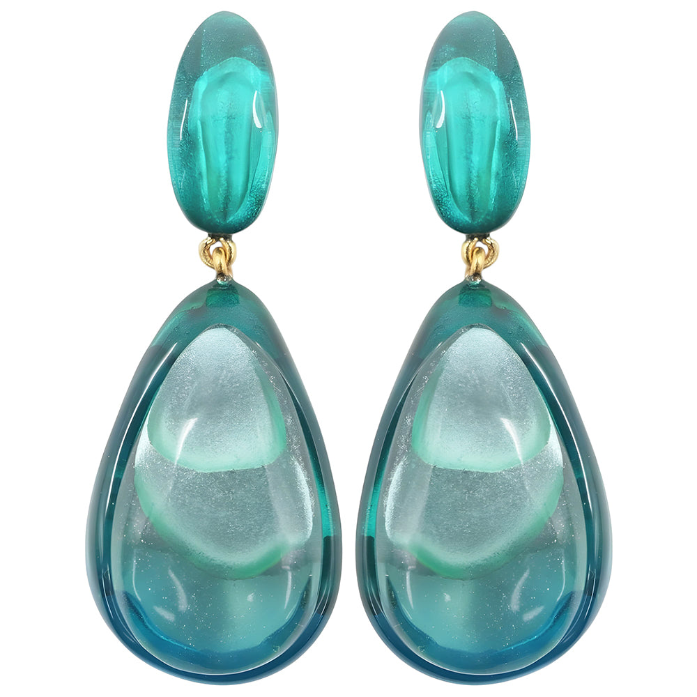 Nouvelle venue dans la collection Palais Royal, nos boucles en résine Alka associent un cabochon ovale à une goutte intérieure en résine infusée de reflets chatoyants. Ce duo crée un contraste saisissant et un jeu de lumière captivant.